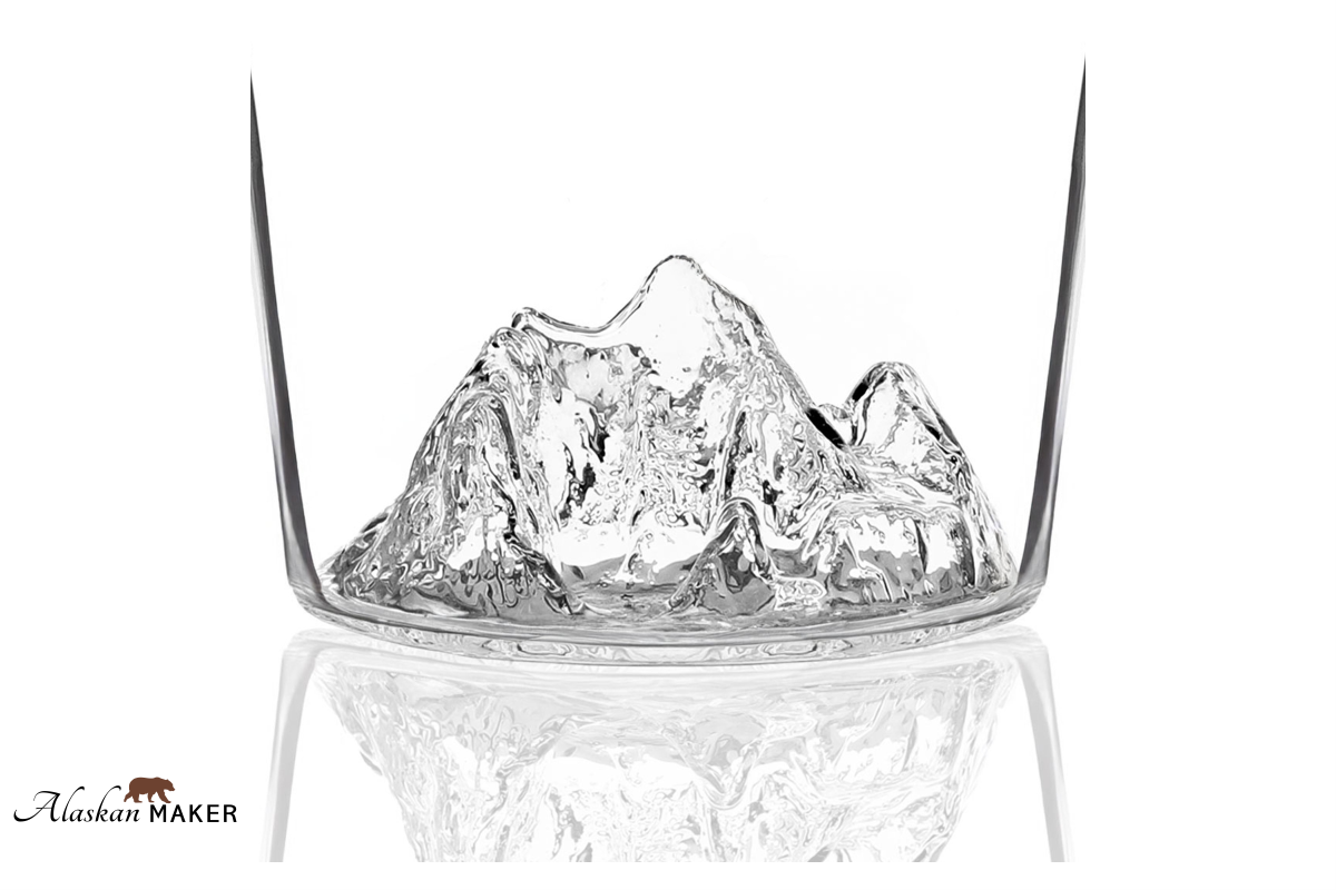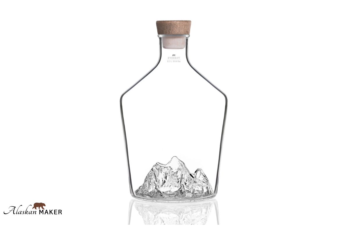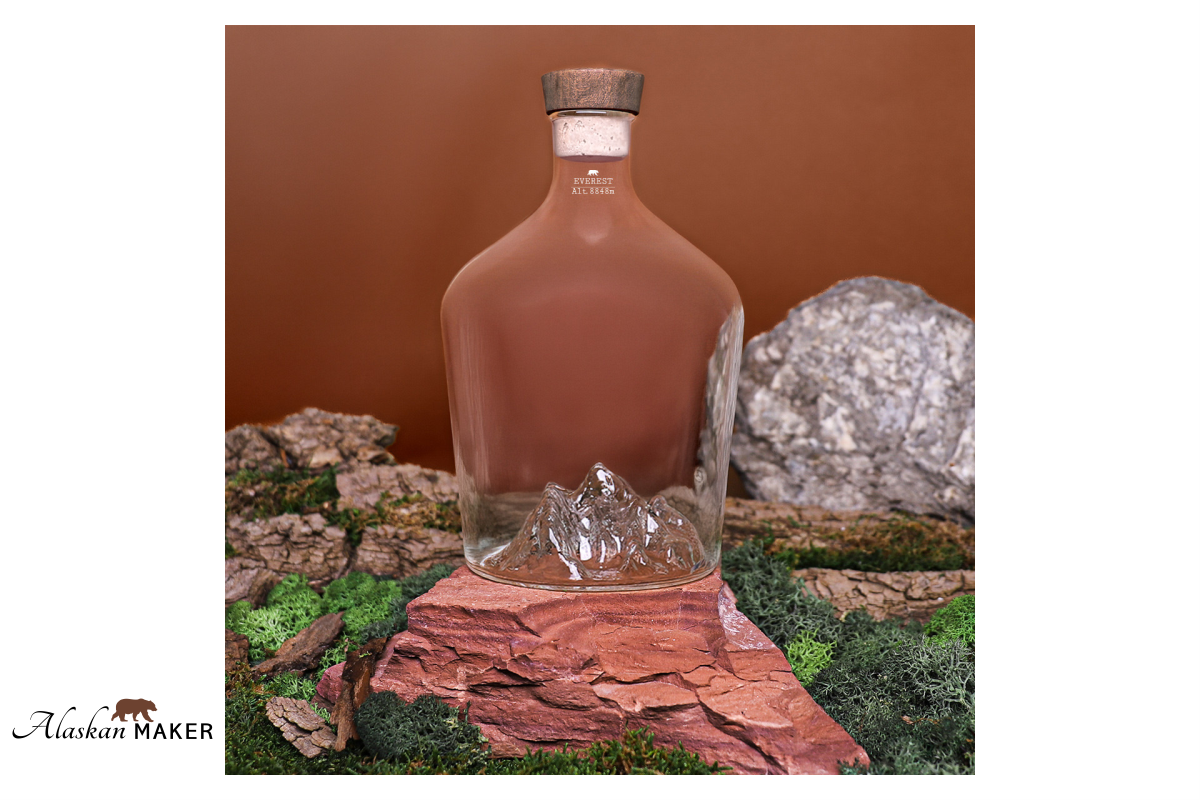 Alaskan MAKER steklenica za žganje z reliefnim dnom v obliki gore Everest. Ročna izdelava, 100% borosilikatno steklo in volumen 1 l.  Premer 12,9 x višina 20,7 cm.