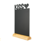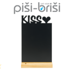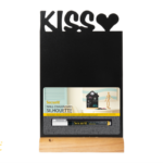 Securit FBTKISS – Silhouette NAMIZNA KREDNA TABLA – idealne za na mizo, pult ali polico. Kompakten lesen lakiran podstavek varno drži dvostransko črno pisalno površino. Držalo za pisalo je v lesenem postavku. Notranja ali zunanja uporaba, v kompletu s KREDAMARKER-jem. Trdi eko kavčukov les, prevlečen s plastmi kakovostnega laka odpornega na različne vremenske pojave.