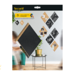 Črne table imajo gladko površino iz lakiranega in obstojnega melamina za markerje s tekočo kredo, ki se jih briše z mokro krpo, table iz plute za pripenjanje pa imajo površino pridobljeno z obdelavo skorje hrasta plutovca. V kompletu s tablami je bel kredamarker in bucike za pripenjanje (6x). Vse table imajo samolepilne trakove za hitro in enostavno pritrditev na katerokoli ravno površino, ker pa so na “ježek” princip, lahko posamezno tablo potegnete s stene in jo uredite na mizi ali pultu.