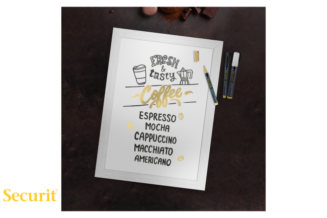 Leseno kredno tablo z okvirjem bele barve, pritrdilni kavelj, žica in črni ter zlati kredamarker.
