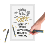 Leseno kredno tablo z okvirjem bele barve, pritrdilni kavelj, žica in črn ter zlati kredamarker.