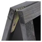 Okvir iz lakiranega bukovega lesa sive barve z rustikalnim, naravnim videzom, odpornega na različne vremenske pojave. Črna pisalna površina z merami 94 x 59 cm, odporna proti UV žarkom, praskam, na obarvanje ali bledenje.