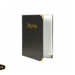 Meni ovitek je iz robustnega umetnega materiala (PVC) za hitro in enostavno čiščenje, na prednji platnici pa sta proti obrabi pritrjena kovinska kotnika zlate barve ter Menu napis s pisanimi črkami za hitro asociacijo na kulinarično ponudbo.