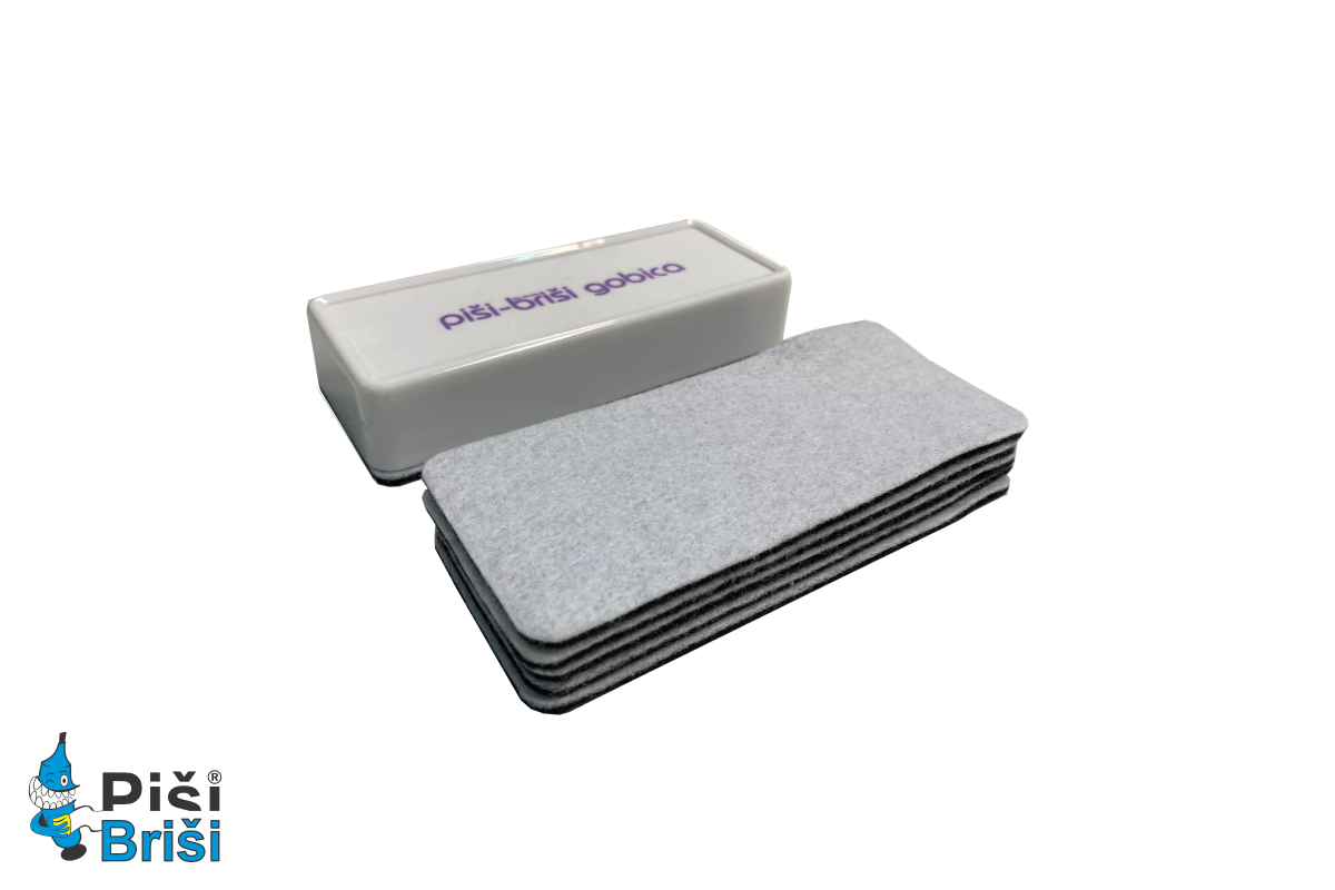 V kompletu je pet zamenljivih blazinic iz filca. Kadar se brisanje markerjev občutno poslabša lahko blazinico iz filca ročno operete v milnici (filc je “zapacan”, kadar se na pisalni površini table pričnejo pojavljati “sence” markerjev), ko se posuši je pripravljena za nadaljnjo uporabo.